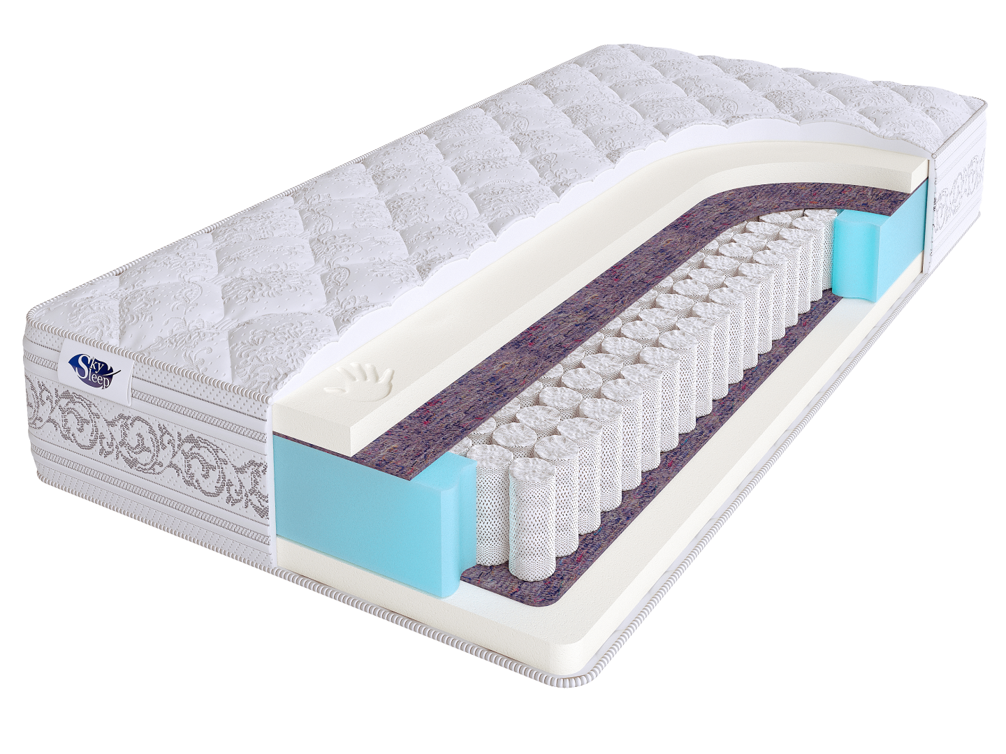 В основе матраса лежит высокотехнологичный блок независимых пружин S500. Особенностью данного блока является то, что каждая пружина размещается в отдельном чехле из прочного воздухопроницаемого материала. Это позволяет пружинам самостоятельно реагировать на вес тела человека и обеспечивать ортопедическую поддержку позвоночника.